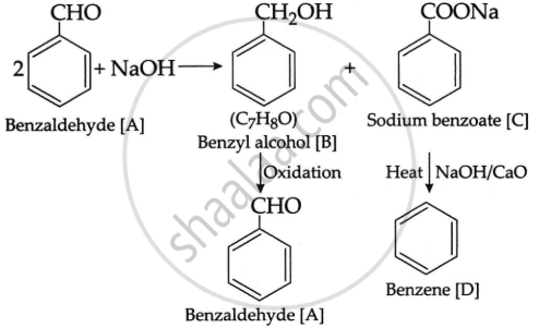 The chemical component [A] must be an aromatic aldehyde, i.e., benzaldehyde with a distinct odour. When benzaldehyde is combined with NaOH. It undergoes Cannizzaro's reaction, yielding benzyl alcohol, [B] of the formula C7H8O and a sodium salt of benzoic acid [C]. Benzyl alcohol degrades into benzaldehyde [A] when oxidised. When heated with soda lime, the chemical [C] produces an aromatic hydrocarbon [D], which is benzene. The enters series of reaction is as given: