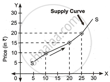 - The X-axis represents the quantity supplied, and the Y-axis represents the price of the commodity. Supply curve ‘SS’ slopes upwards from left to right, which has a positive slope. It indicates a direct relationship between price and quantity supplied.
