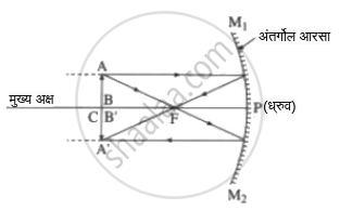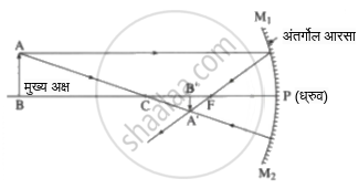 C: वक्रता केंद्र, F: मुख्य नाभी, PF: नाभीय अंतर (f), PC: वक्रता त्रिज्या (R), AB: वस्तू, A'B': प्रतिमा, PB: वस्तूचे अंतर (u), PB': प्रतिमेचे अंतर (v)