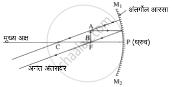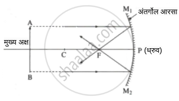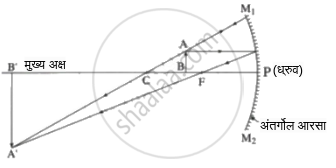 P: ध्रुव, C: वक्रता केंद्र, F: मुख्य नाभी, PF: नाभीय अंतर (f), PC: वक्रता त्रिज्या (R), AB: वस्तू, A'B': प्रतिमा, PB: वस्तूचे अंतर (u), PB': प्रतिमेचे अंतर