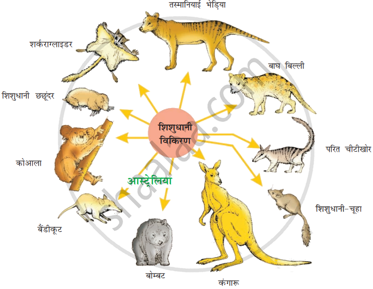 एक विशेष भू-भौगोलिक क्षेत्र में विभिन्न प्रजातियों के विकास का प्रक्रम एक बिंदु से शुरू होकर अन्य भू-भौगोलिक क्षेत्रों तक प्रसारित होने को अनुकूलनी विकिरण (ऐडेप्टिव रेडिऐशन) कहते हैं। डार्विन की फिंच इस प्रकार की घटना का एक सर्वोत्तम उदाहरण प्रस्तुत करती है। एक अन्य उदाहरण आस्ट्रेलियाई मार्सुपियल (शिशुधानी प्राणियों) का है। अधिकांश मार्सुपियल जो एक दूसरे से बिल्कुल भिन्न थे; एक पूर्वज प्रभाव से विकसित हुए, और वे सभी आस्ट्रेलियाई महाद्वीप के अंतर्गत हुए हैं। जब एक से अधिक अनुकूली विकिरण एक अलग-अलग भौगोलिक क्षेत्र में (भिन्न आवासों का प्रतिनिधित्व करते हुए) प्रकट होते हैं तो इसे अभिसारी विकास कहते हैं।