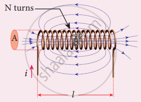 Consider a long solenoid of length l and cross-sectional area A. Let n be the number of turns per unit length (or turn density) of the solenoid. When an electric current i is passed through the solenoid, a magnetic field is produced by it which is almost uniform and is directed along the axis of the solenoid. The magnetic field at any point inside the solenoid is given by