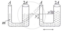 AU-tube is of non uniform cross-section. The area of cross-sections of two sides of tube are A and 2A (see fig.). It contains non-viscous liquid of mass m. The liquid is displaced slightly and free to oscillate. Its time period of oscillations is ______.