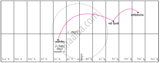 खालील आकृतीमध्ये ब्राझिलियातून ३१ डिसेंबरच्या सकाळी ११ वाजता विमान निघाले आहे. हे विमान ०° रेखावृत्त ओलांडून नवी दिल्लीमार्गे व्लॉदिवोस्टॉक क याठिकाणी जाणार आहे. ज्यावेळेस विमान निघाले त्यावेळेस नवी दिल्ली आणि व्लॉदिवोस्टॉक येथील स्थानिकवेळ, दिवस व तारीख काय असेल ते सांगा.