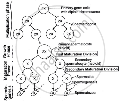 - Maturation Phase: Primary spermatocytes undergo two divisions, known as maturation divisions. The first maturation division is reductional or meiotic. The original spermatocyte differentiates into two haploid daughter cells, known as secondary spermatocytes. Secondary spermatocytes undergo a second maturation division, resulting in four haploid spermatids from each main spermatocyte.