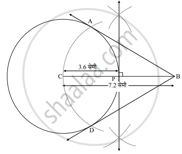 C केंद्र व त्रिज्या 3.6 सेमी घेऊन वर्तुळ काढा. वर्तुळकेंद्रापासून 7.2 सेमी अंतरावर बिंदू B घ्या. बिंदू B मधून वर्तुळाला स्पर्शिका काढण्यासाठी खालीलप्रमाणे कृती करा.