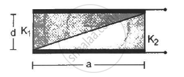 A capacitor is formed by two square metal-plates of edge a, separated by a distance d. Dielectrics of dielectric constant K1 and K2 are filled in the gap as shown in figure . Find the capacitance.