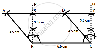 - Similarly, from point C on line PQ, mark point D such that CD = 4.5 cm (since opposite sides of a parallelogram are equal).