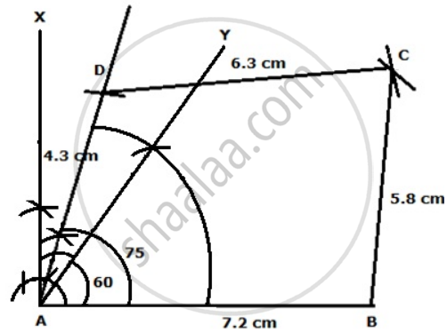 AB = 7.2cm, BC = 5.8cm, CD = 6.3cm, AD = 4.3cm and ∠A = 75°