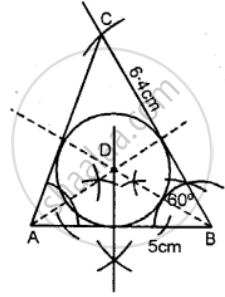 Construct a triangle ABC with AB = 5 cm, ∠B = 60° and BC = 6. 4 cm. Draw the incircle of the triangle ABC.