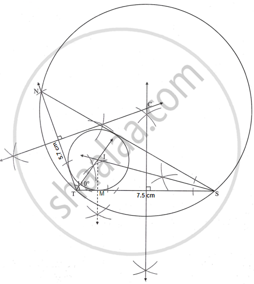 Construct ΔNTS where NT = 5.7 cm, TS = 7.5 cm and ∠NTS = 110° and draw incircle and circumcircle of it.