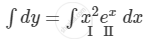 \[ \Rightarrow \int dy = x^2 \int e^x dx - \int\left( \frac{d}{dx}\left( x^2 \right)\int e^x dx \right)dx\]