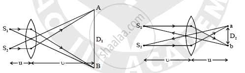 and the eyepiece. The distance D can be measured directly with the help of the scale marked on the optical bench. To measure the band width X , the micrometer screw fitted to the eyepiece is adjusted such that the vertical cross-wire is made coincide with one of the bright bands. The micromater reading X1 is noted By rotating the screw in the same sense, the vertical cross-wire is made coincide with successive bright bands and the corresponding reading X2,X3, X4.....etc. are noted. The mean value of (X2–X1),(X3–X2),(X4–X3)... etc are noted. The mean value of (X2–X1),(X3–X2),(X4–X3).... etc gives the mean band widthX . To measured the distance between two coherent sources, a convex lens is mounted on the stand between the biprism and the eyepiece. Without disturbing the slit and the biprism, the eyepiece stand is moved along the bench so that the distance the slit and the eyepiece is more than four times the focal length of the lens. The lens stand is moved towards the biprism and its position (L1) is so adjusted that the two magnified images of the slit are seen through the eyepiece by rotating the micrometer screw. The vertical cross-wire in the eyepiece is made to coincide with each image and the corresponding reading is noted. The difference between these two reading gives the distance d1 between the two magnified images. The lens is moved towards the eyepiece and its position (L2) is so adjusted that two diminished images of the slit are seen through the eyepiece. The distance d2 between these images is measure as in case of d1 Then the distance between the two coherent sources is given by `d=sqrt(d_1d_2)`