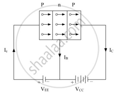 The holes in the emitter are pushed into the base by the positive terminal of battery of voltage VEE. Since, base is thin and lightly doped so only few holes combine with electrons in the base. Thus, base current IB is small. Since VCC is quite large almost 99% of holes coming from emitter are collected by collector. For each hole reaching the collector, an electron is released from the negative terminal of the collector base battery to neutralize the hole. For each hole consumed in collector, a bond breaks in emitter and electron is released that enters positive terminal of emitter-base battery. Thus, we can say the current is carried by holes inside the transistor and by electrons in external circuit.