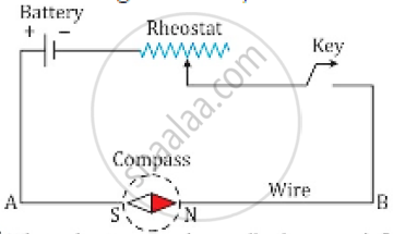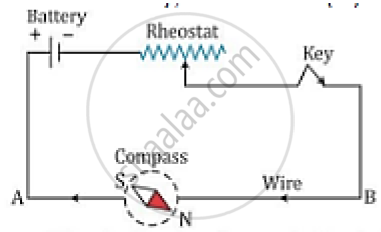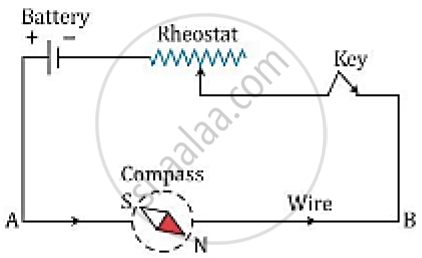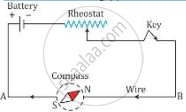 In Fig , AB is a wire lying in the north- south direction and connected to a battery through a rheostat and a tapping key. A compass needle is placed just below the wire. It is observed that
