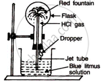 The high solubility of HCI gas can be demonstrated by "Fountain experiment''. In it, a well dried round bottom flask is filled with dry HCI gas and fitted with a two holed rubber stopper. A jet tube is inserted into the flask through one of the holes. A dropper filled with water is fitted into the other hole. Closing the outer end of the jet tube, the flask is inverted and the tube is dipped into a blue litmus solution taken in a beaker, then dropper is pressed. It is seen that the blue litmus solution enters the jet tube with a great force, forming a red fountain