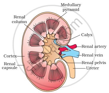 In humans, the excretory system consists of a pair of kidneys, one pair of ureters, a urinary bladder and a urethra. Kidneys are reddish-brown, bean-shaped structures situated between the levels of last thoracic and third lumbar vertebra close to the dorsal inner wall of the abdominal cavity. Each kidney of an adult human measures 10-12 cm in length, 5-7 cm in width and 2-3 cm in thickness with an average weight of 120-170 g. Towards the centre of the inner concave surface of the kidney is a notch called the hilum through which the ureter, blood vessels and nerves enter. Inner to the hilum is a broad funnel-shaped space called the renal pelvis with projections called calyces. The outer layer of kidney is a tough capsule. Inside the kidney, there are two zones, an outer cortex and an inner medulla. The medulla is divided into a few conical masses (medullary pyramids) projecting into the calyces (sing.: calyx). The cortex extends in between the medullary pyramids as renal columns called Columns of Bertini. Each kidney has nearly one million complex tubular structures called nephrons, which are functional units.