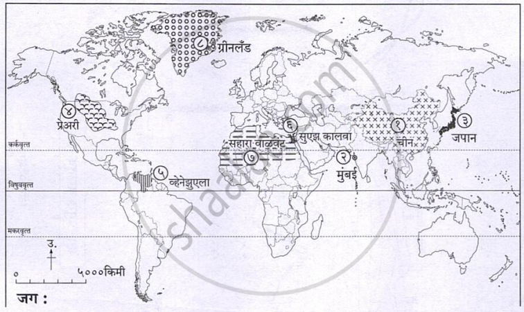 दिलेल्या जगाच्या नकाशामध्ये पुढील बाबी योग्य चिन्हांच्या साहाय्याने दाखवा आणि सूची तयार करा: