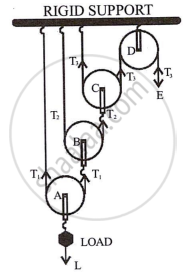 Velocity Ratio: When a string crosses a movable pulley, its other end travels up twice as far as the pulley's axle moves. This is because one end of the string is stationary. If the load L attached to the pulley A moves up by distance X i.e. dL = X, the string connected to the axle of pulley B moves up by a distance 2 × x = 2x, the string connected to the axle of pulley c moves up by a distance 2 × 2x = 22 x and the end of the string moving over the fixed pulley D moves up by a distance 2 × 22 x = 23 x, i.e. the effort E moves by a distance 23x or dE = 23 x