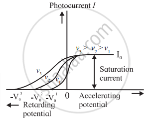 Draw a neat labelled diagram of photo-current as a function of accelerating potential for fixed incident intensity but different incident frequencies for the same emitter material.