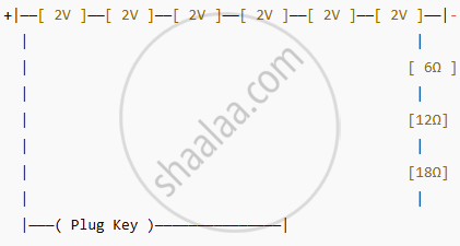 Draw a schematic diagram of a circuit consisting of a battery of six 2V cells, a 6 Ω resistor, a 12 Ω resistor, and a 18 Ω resistor and a plug key all connected in series. Calulate the following (when key is closed):