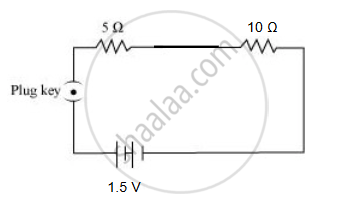 Draw a schematic diagram of an electric circuit of a cell of 1.5 V, 5 Ω and 10 Ω resistor and a plug key, all connected in series. Calculate the current drawn from the cell when the key is closed.