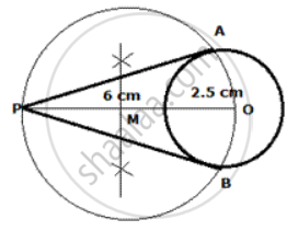 Draw a circle with centre O and radius 2.5 cm. Take a point P at a distance of 6 cm from the centre. Using ruler and compasses only construct the tangents to the circle from the point P.