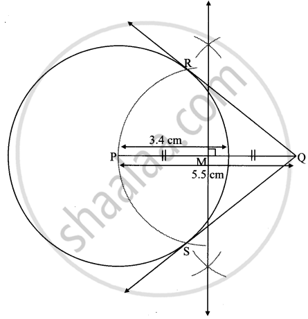 Draw a circle with centre P and radius 3.4 cm. Take point Q at a distance 5.5 cm from the centre. Construct tangents to the circle from point Q.
