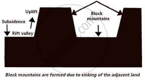 Block mountain: They are formed by rupturing or fracturing of rock strata due to strain. The land between the cracks inside the earth sinks leaving upstanding blocks on either side making mountains.