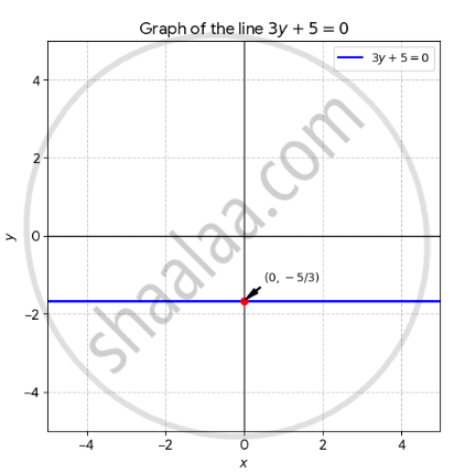 The graph of the equation 3y + 5 = 0 is a horizontal line passing through the `y = - 5/3` (approximately –1.67).