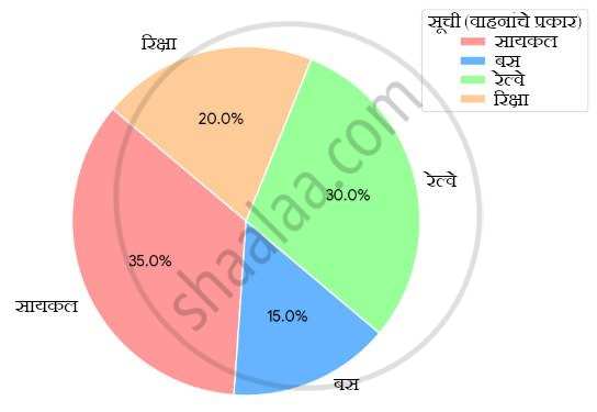 | वाहनाचा प्रकार | विद्यार्थ्यांचे शेकडा प्रमाण | वाहतुकीचा प्रकार पसंत करणाऱ्या विद्यार्थ्यांची टक्केवारी | केंद्रीय कोन |