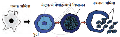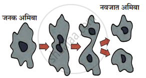 - साधे द्विविभाजन - अमिबा विशिष्ट आकार नसल्याने कोणत्याही अक्षातून विभाजित होतो; म्हणून याला ‘साधे द्विविभाजन’ म्हणतात.