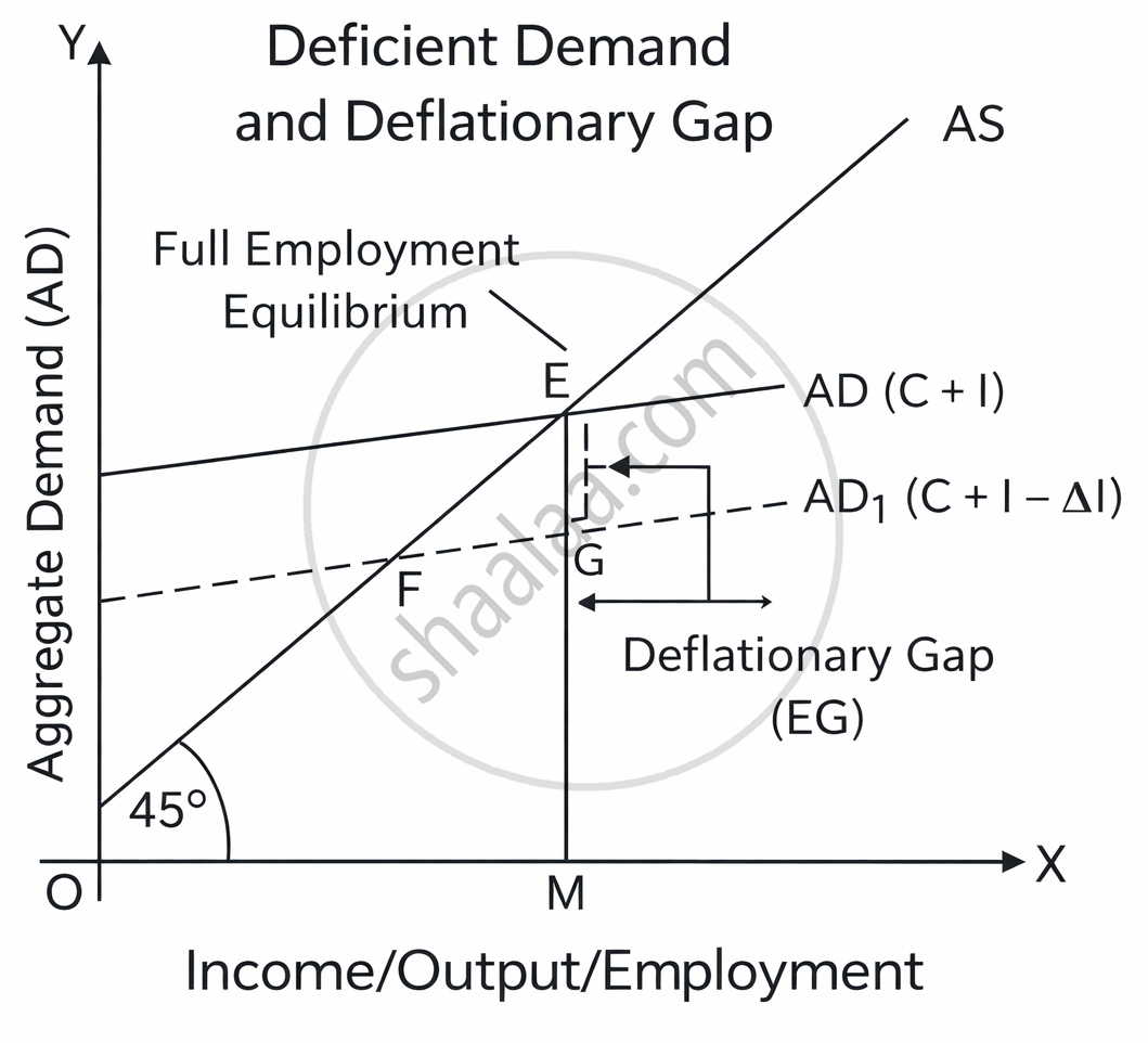 When demand is weak, the economy cannot be in equilibrium at full employment. The lack of demand will cause a drop in output and income to OY1 (below full employment), resulting in unemployment in the economy. Because aggregate demand is insufficient to purchase potential output, producers in the economy would prefer to create less. As a result, income, output, and employment will decline. Thus, a lack of demand indicates underutilisation of resources. Deficient demand causes prices to decline due to an abundant supply. Thus, insufficient demand reduces the economy's income, output, employment, and prices, putting it into an underemployment equilibrium. The underemployment equilibrium is the level of income below the full-employment level. In other words, insufficient demand can lead to deflation. This is why insufficient demand (or gap) is referred to as the ‘deflationary gap’. Deflationary demand occurs when aggregate supply exceeds aggregate demand at full employment. The deflationary gap is the difference between actual aggregate demand and the level of aggregate demand required to achieve equilibrium at full employment income.