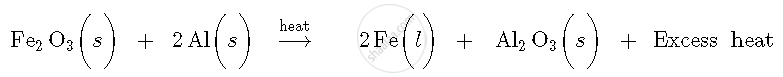 When iron (III) oxide and aluminium powder are heated together, aluminium acts as a reducing agent and reduces iron (III) oxide to iron metal. It also gets oxidised to aluminium oxide with the liberation of excess heat. As excess heat is liberated in the reaction, the product, i.e., iron metal is formed in molten state. This reaction is an oxidation-reduction reaction and its chemical equation is: