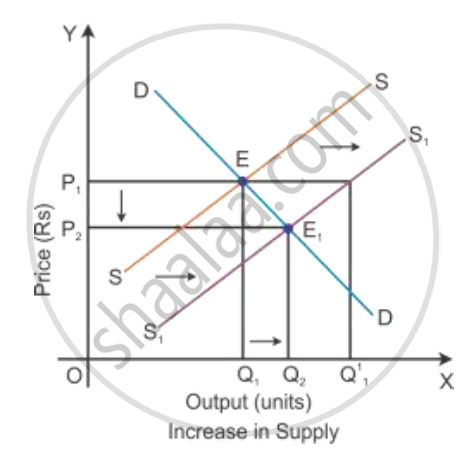 When there is the change in other factors than price, there will be the rise in the supply of goods. There will be a shift in the supply curve towards the right to SS1 with an increase in the supply, and the demand curve DD will remain the same. This implies that there will be a situation of excess supply at the equilibrium point.