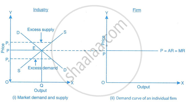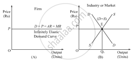 In the figure, part A depicts the infinitely elastic demand curve faced by an individual firm in a perfectly competitive market. Part B depicts how the market demand and market supply curves interact to determine the market price. The market price OP is determined by the intersection of the market (industry) demand curve DD and the market (industry) supply curve SS. The market equilibrium is at point E, where OQx (amount of output) is supplied at the equilibrium market price OP. The price for the commodity is given to an individual firm, and no single firm can influence the market price. The firm faces an infinitely elastic demand curve, which suggests that no matter how many units of output are supplied, the price will remain the same. Hence, we can conclude that under a perfect competition market, an individual firm is a price taker and not a price maker.