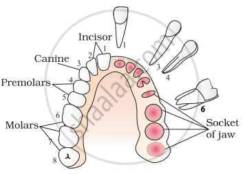 Arrangement of different types of teeth in the jaws on one side and the sockets on the other side