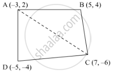 Let the vertices of the quadrilateral be A (−3, 2), B (5, 4), C (7, −6), and D (−5, −4). Join AC to form two triangles ΔABC and ΔACD.