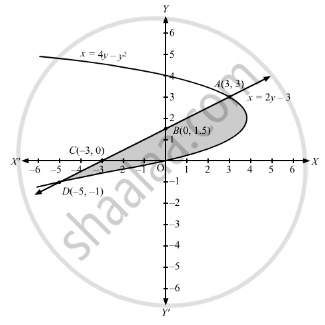 \[A = \int_{- 1}^3 \left| x_1 - x_2 \right| dy.......\text{ where, }x_1 = 4y - y^2\text{ and }x_2 = 2y - 3\]