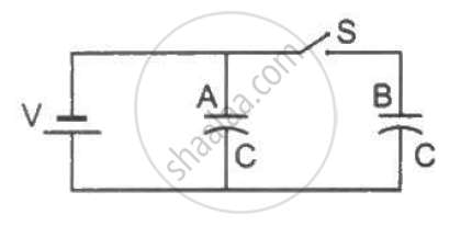 Figure shows two identical parallel plate capacitors connected to a battery through a switch S. Initially, the switch is closed so that the capacitors are completely charged. The switch is now opened and the free space between the plates of the capacitors is filled with a dielectric of dielectric constant 3. Find the ratio of the initial total energy stored in the capacitors to the final total energy stored.