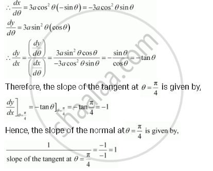 Find the slope of the normal to the curve x = acos3θ, y = asin3θ at `theta = pi/4`