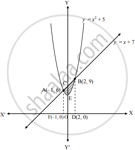 = area under the line y = x + 7 – area under the curve y = x2 + 5