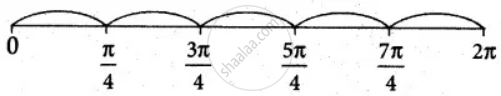 x = `pi/4, (3pi)/4, (5pi)/4, pi/4 ∈x = (0, 2π)`
