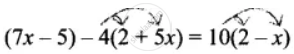 7x – 5 – 4 × 2 – 4 × 5x = 10 × 2 + 10 × (– x)