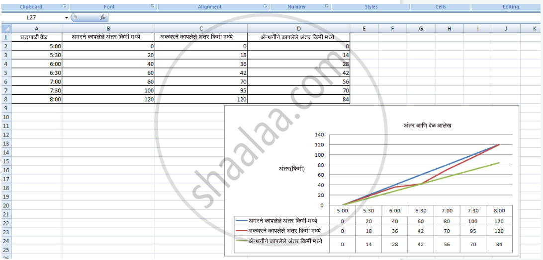 | घड्याळी वेळ | अमरने कापलेले अंतर किमी मध्ये | अकबरने कापलेले अंतर किमी मध्ये | ॲन्थनीने कापलेले अंतर किमी मध्ये |