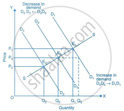 When there is a change in consumers’ tastes in favour of a product, the demand for that product increases. This results in a rightward shift of the demand curve, while the supply curve remains unchanged. As shown in the diagram, the original equilibrium is at point E0, where the initial demand curve D0D0 intersects the supply curve SS. The corresponding equilibrium price is P0, and the equilibrium quantity is Q0. Due to increased consumer preference, the demand curve shifts to the right, becoming D1D1. This shift leads to a new equilibrium at point E1, where the price rises from P0 to P1 and the quantity increases from Q0 to Q1. Thus, a favourable change in consumers’ tastes causes both the equilibrium price and quantity to increase.