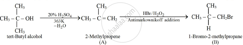 \[\ce{tert-butyl alcohol ->[20‰H2SO4][363K] A + H2O ->[HBr][H2O2] B}\]