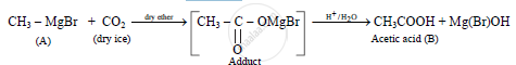 `CH_3-Br+Mg"dry ether"/""A+CO_2"dry ether"/(H^+/(H_2O))B+Mg(Br)OH`