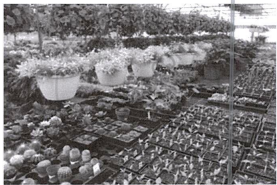 The image shows a nursery or plant growing business, which is an example of a genetic industry. Genetic industries involve the breeding, reproduction, and multiplication of plants and animals. In this case, the business is focused on growing and selling plants, which directly ties to the characteristics of genetic industries.