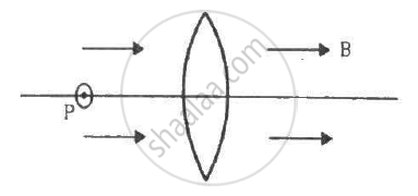The figure shows a convex lens of focal length 12 cm lying in a uniform magnetic field Bof magnitude 1.2 T parallel to its principal axis. A particle with charge 2.0 × 10−3 C and mass 2.0 × 10−5 kg is projected perpendicular to the plane of the diagram with a speed of 4.8 m s−1. The particle moves along a circle with its centre on the principal axis at a distance of 18 cm from the lens. Show that the image of the particle moves along a circle and find the radius of that circle.